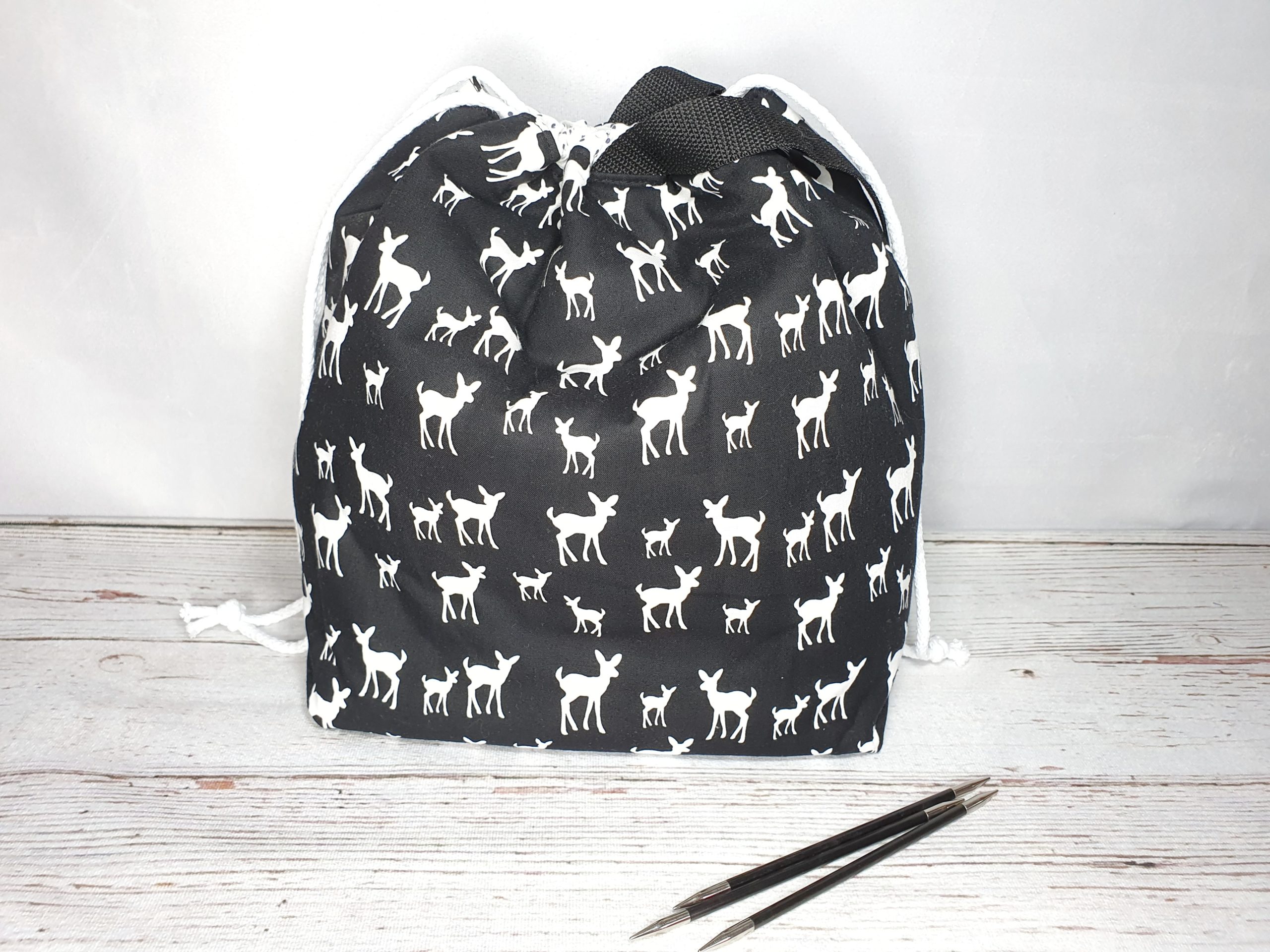 Projektbeutel mit Rehen für dein Strickzeug und Häkelzeug. Da passt viel hinein, bis zu 600 g Wolle kannst gut darin verstauen (auf dem Bild ist die Tasche mit 6 Strängen à 100 g gefüllt). Geeignet auch für größere Projekte wie leichte Pullover, große Tücher oder ähnliches, aber auch das Sockenstrickzeug findet natürlich seinen Platz.
