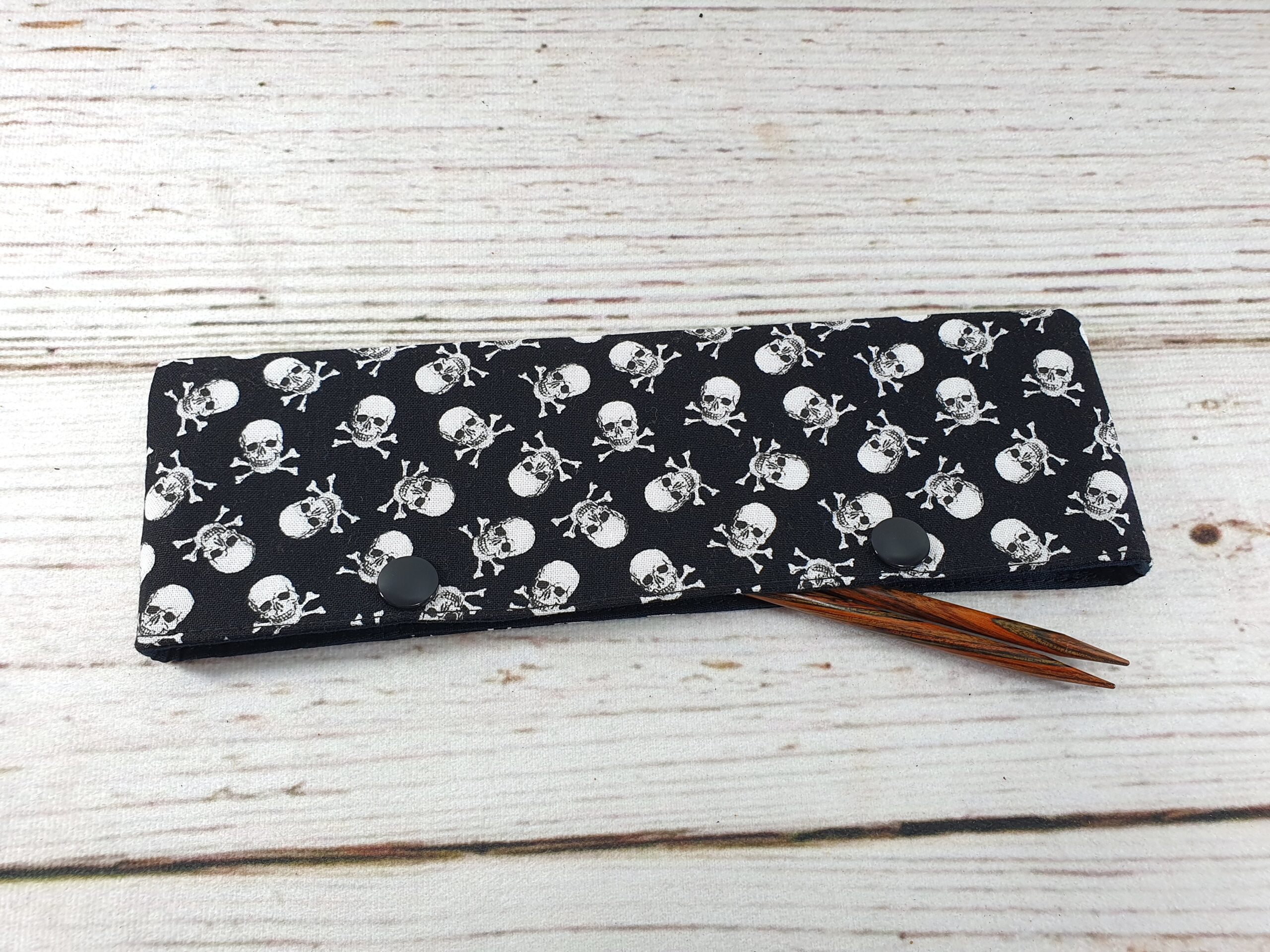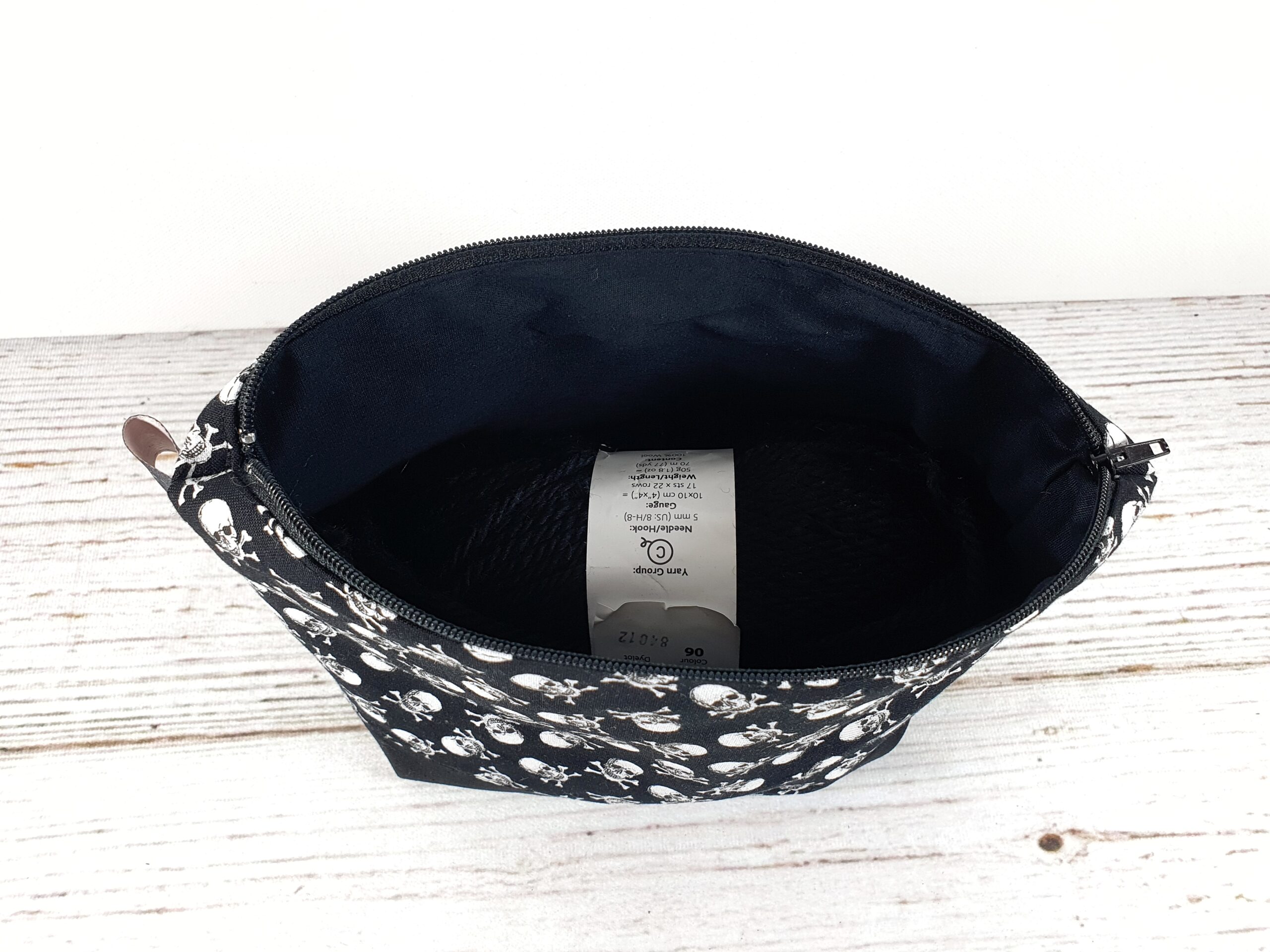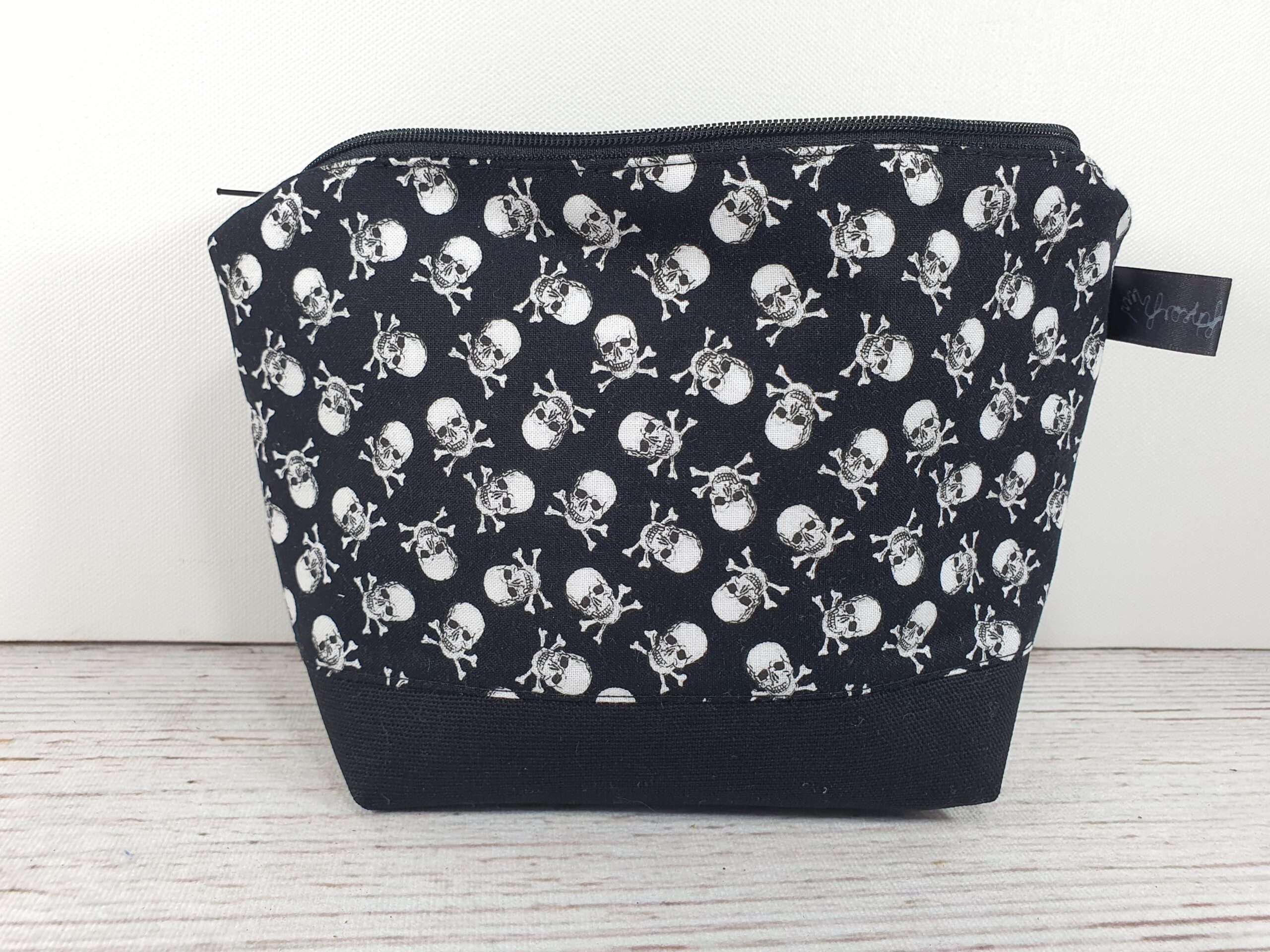Projekttasche mit mini Totenköpfen für dein Handarbeitszeug oder als Kosmetiktasche. Ein Trageriemen sorgt dafür, dass du sie überall hin mitnehmen kannst (Größe XS hat keinen Trageriemen)