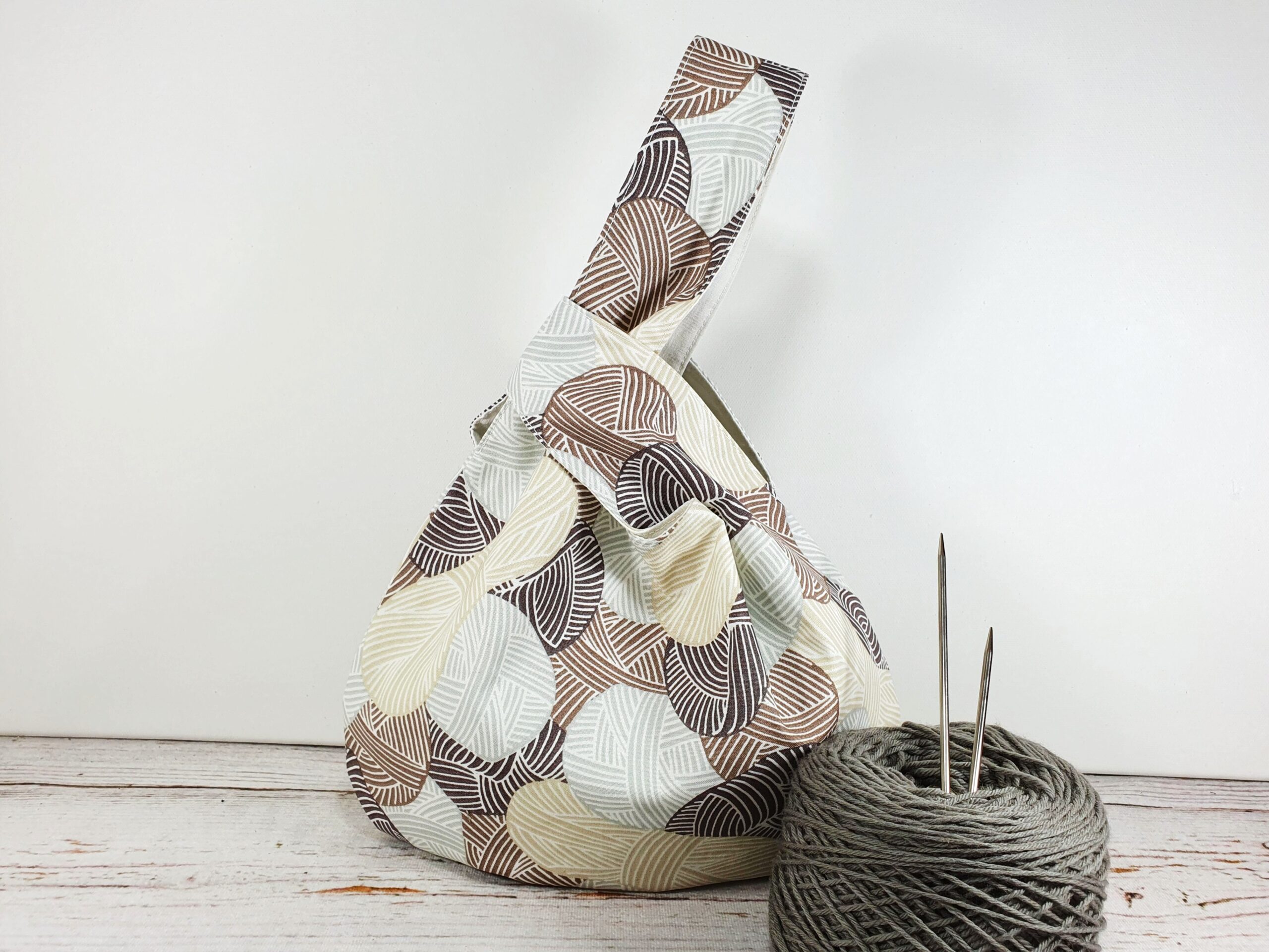 Strickprojekttasche mit Reißverschluss XS mit Wollknäuel beige, braun und grau für das Strickzeug oder Häkelprojekt.