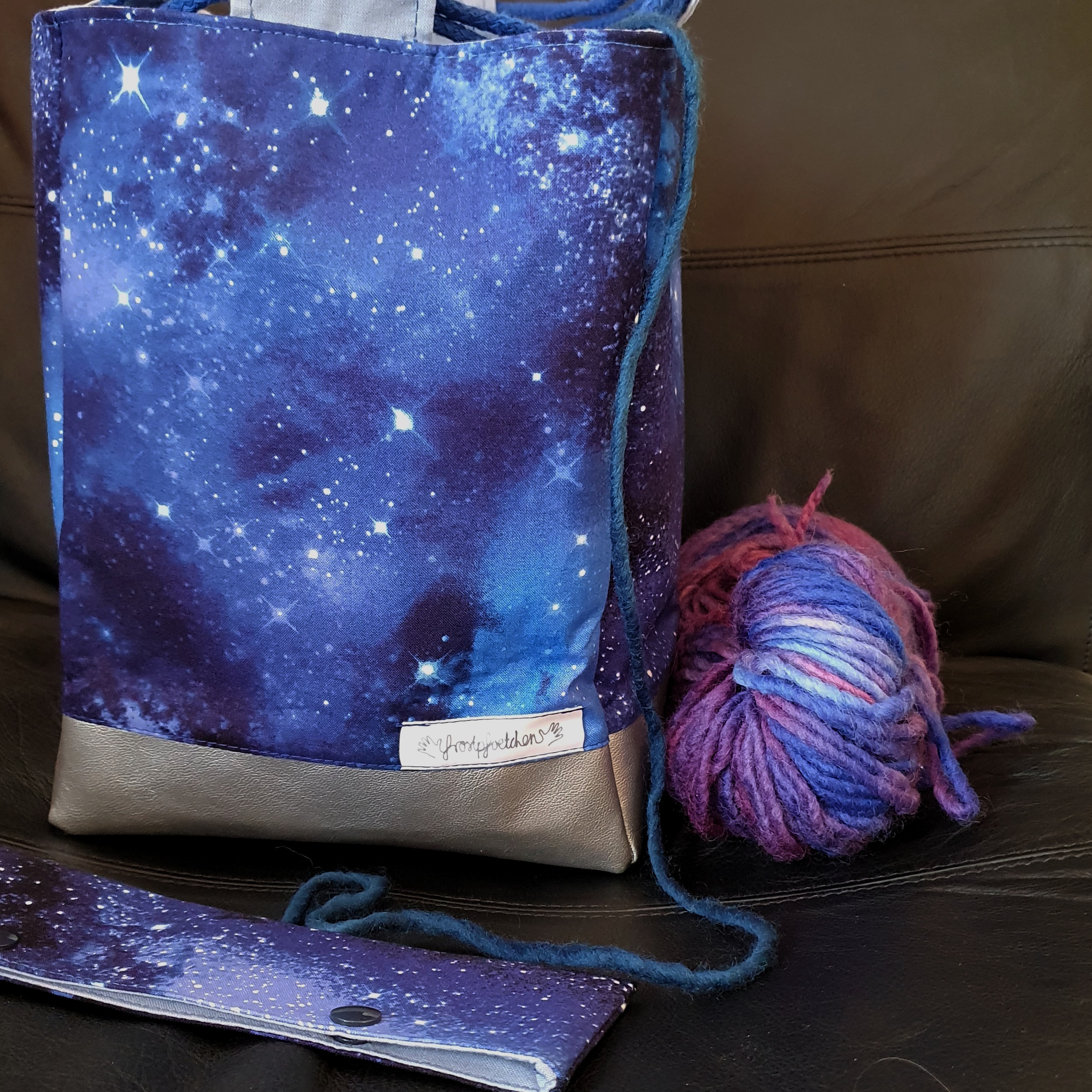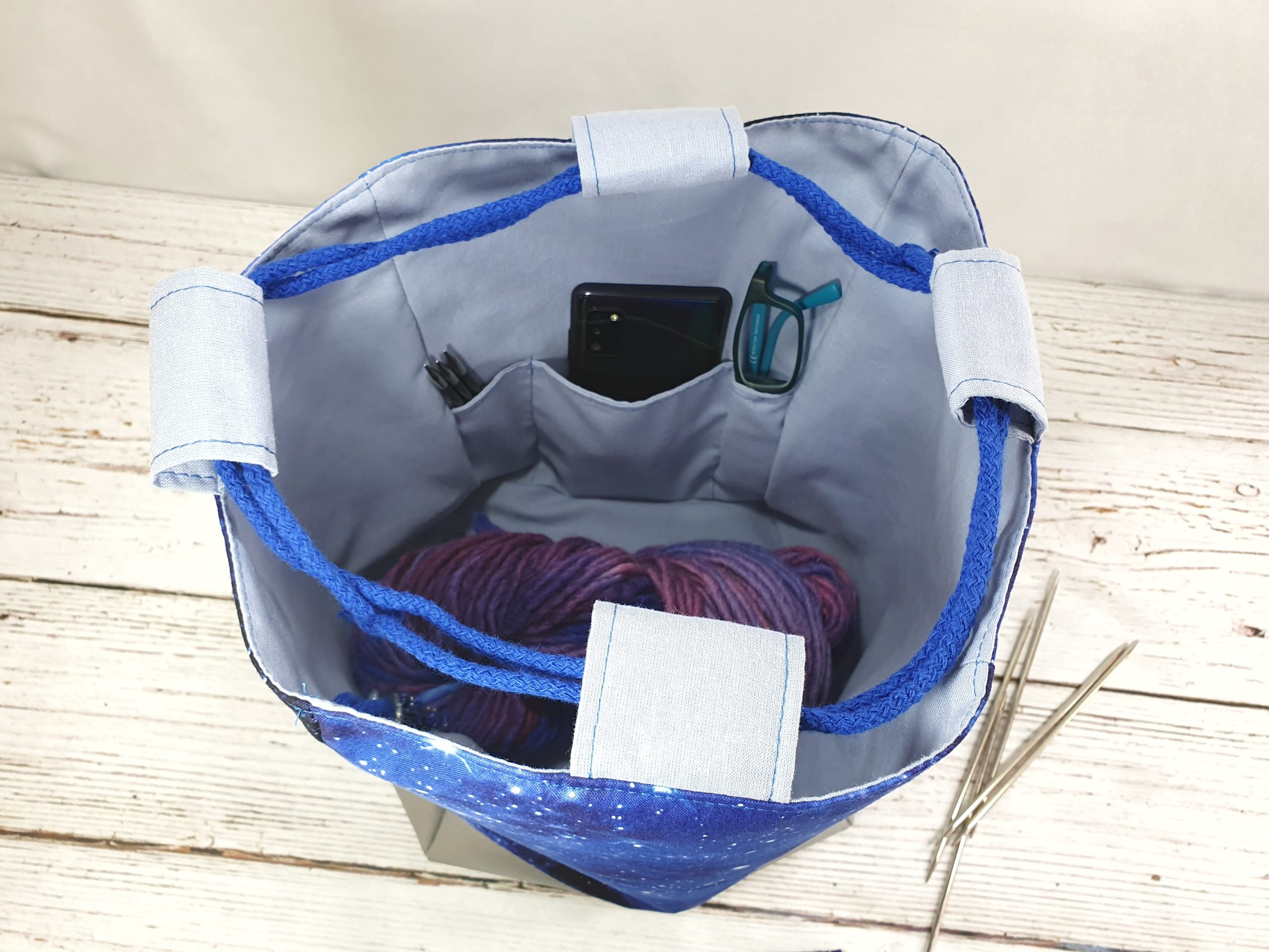 RiceBag Größe M „Sternenhimmel“ mit silbernem Kunstlederboden. Gearbeitet im Stil einer japanischen Komebukuro bag, für mehr Ordnung in deinen Projekten. Du kannst dein Strickzeug oder Häkelzeug überall hin mitnehmen, 400-500 g Wolle (je nach Stärke) passen gut hinein. Geeignet für mittlere Projekte, Tücher, leichte Sommerpullover und dergleichen.